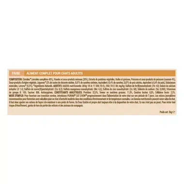 Lorsque votre chat devient adulte (à l’âge d’un an), ses besoins nutritionnels changent et vous devez adapter son alimentation en conséquence. Il est important qu'il reçoive l'équilibre nutritionnel adapté à sa vie d'adulte pour rester en bonne santé. PURINA® CAT CHOW® Adult riche en saumon contient tous les nutriments essentiels pour que votre chat mène une vie active et saine. Il contient de la vitamine E pour soutenir ses défenses naturelles, des vitamines du groupe B pour aider son organisme à utiliser efficacement les nutriments et des protéines de qualité, soigneusement sélectionnées, pour maintenir sa masse musculaire. PURINA® CAT CHOW® Adult est un aliment complet et équilibré, contenant également es prébiotiques naturels qui contribuent au bon fonctionnement du système digestif.