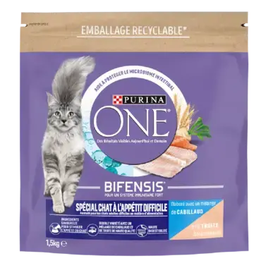 Grâce à ses ingrédients de haute qualité et sa double variété (élaboré avec du cabillaud et de la truite sélectionnés), PURINA® ONE® Spécial Chat difficile garantie une recette savoureuse qui stimule l'appétit de votre chat.