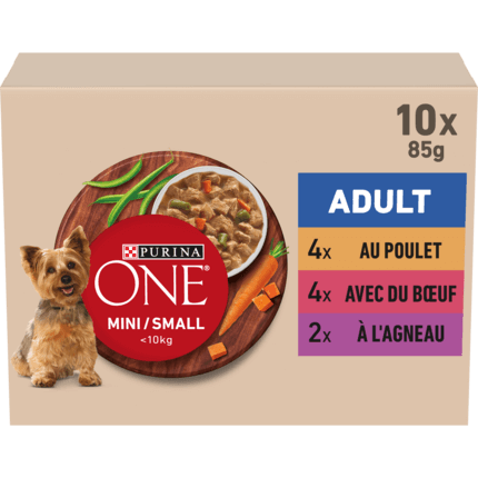 PURINA® ONE® MINI/SMALL < 10kg Adult est une recette complète riche en Bœuf et enrichie en antioxydants pour des défenses naturelles fortes et en nutriments essentiels pour favoriser une bonne hygiène bucco-dentaire.
